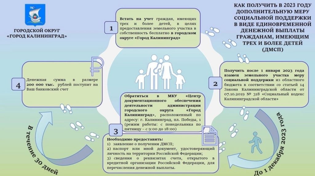 Также важно! Воспользоваться выплатой в 200000рублей смогут семьи, которые стоят в очереди на землю именно в городе Калининград! не менее 3х лет.