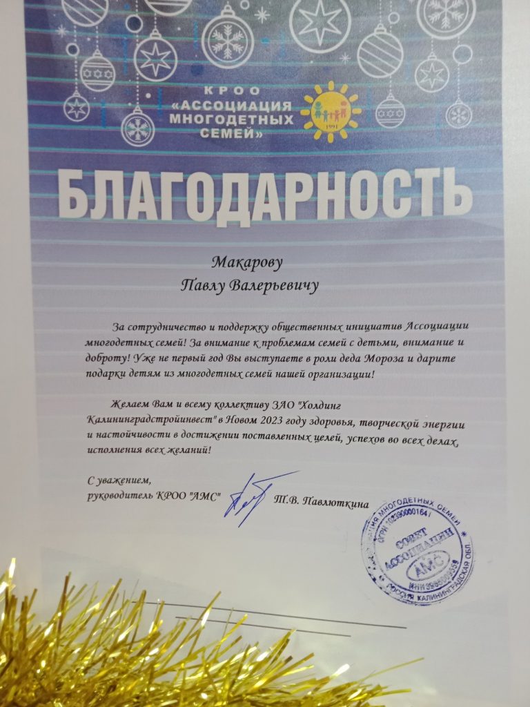 Спасибо депутату Законодательного собрания КО Валерию Михайловичу Макарову и директору ЗАО ” Холдинг Стройинвест” Павлу Валерьевичу Макарову за сотрудничество и чудесные сладкие подарки для детей из многодетных семей!