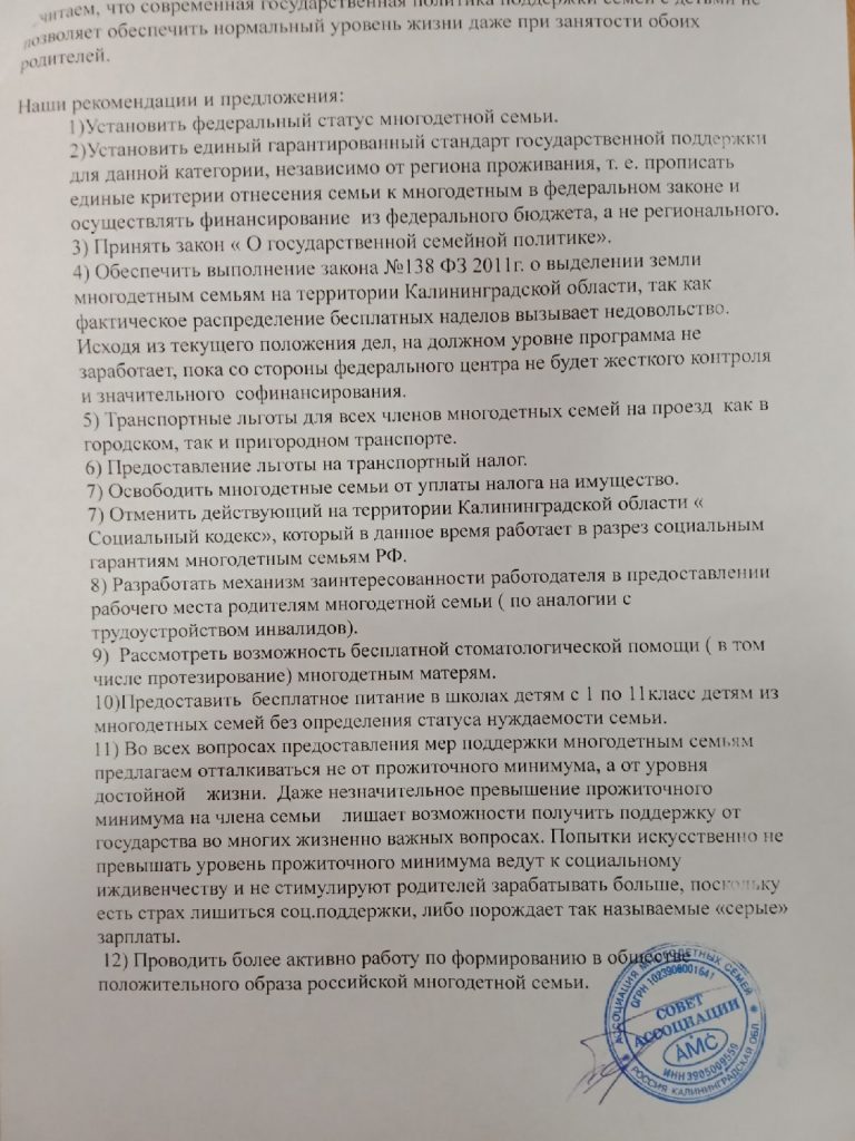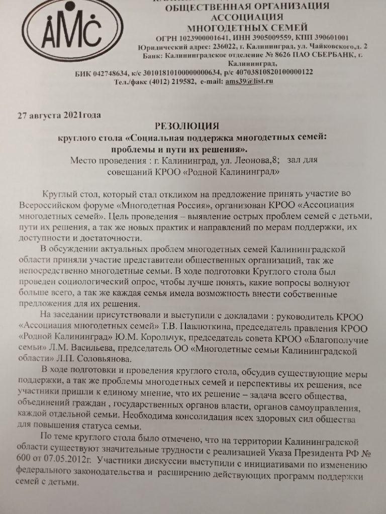 Изучив результаты анкетирования и соц. опроса, в котором мы пригласили вас поучаствовать, был сделан анализ ответов и предложений , проведен круглый стол и составлена резолюция по социальным вопросам, которые более всего волнуют многодетные семьи Калининградской области. Данный документ отправлен в Москву ,где по результатам работы Форума будет включен в “Многодетный наказ” и передан для дальнейшей работы в органы исполнительной и законодательной власти РФ.